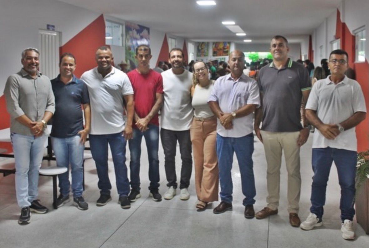 Os vereadores Vevéu, Arivelton Mota, Jó Queiroz, Bruno da Dengue, Alex da Metalúrgica, Eli de Pedras Altas, a vereadora Leide Rios, Val de Pedrinho e o presidente Professor Ney estiveram presentes na inauguração do Polo Formativo Educacional.
